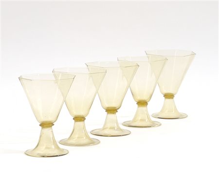 Vittorio Zecchin (Murano 1878 - Murano 1947) Lotto di cinque bicchieri a coppa troncoconica ottagonale, in vetro soffiato pagliesco trasparente. Manifattura Cappellin-Venini, Murano, anni '20. (h cm 13,5) -EN Lot comprising five conical coupe glasses in transparent yellow blown glass. Manufacture of Cappellin-Venini, Murano, 1920s. (h 13.5 cm.)
