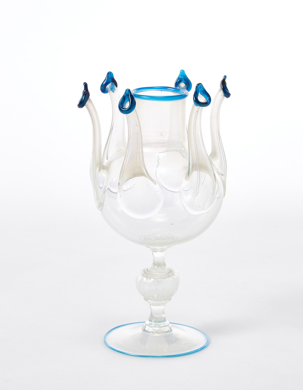 Manifattura di Murano. Tulipaniera con sei beccucci, in vetro soffiato incolore, orli applicati in vetro blu trasparente. Base applicata a balaustro costolato. Fine secolo XIX/inizio secolo XX. (h cm 21,5) -EN Tulip vase with six spouts, in colorless blown glass, applied edges in transparent blue glass. Ribbed baluster base applied. Late XIX/early XX century. (h 21.5 cm.)