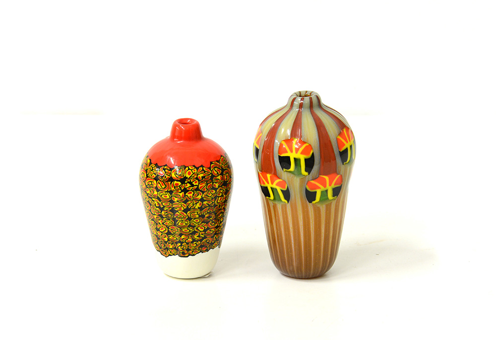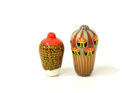 Gabriele Urban Lotto di due vasetti in vetro soffiato rispettivamente a murrine nere, gialle e rosse e canne lattimo e rosse, a murrine gialle, nere, arancio e canne beige, marrone e rosso. Murano, esecuzione recente. Firmati a punta sotto la base "Urban G. Murano". (h max cm 15) -EN Lotto di due vasetti in vetro soffiato rispettivamente a murrine nere, gialle e rosse e canne lattimo e rosse, a murrine gialle, nere, arancio e canne beige, marrone e rosso. Murano, esecuzione recente. Firmati a punta sotto la base "Urban G. Murano". (h max cm 15)