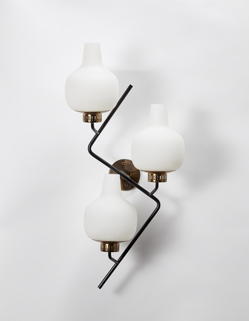 Stilnovo Applique a tre fiamme in metallo laccato nero, ottone e vetro lattimo incamiciato e acidato sulla superficie esterna. Milano, anni '50. (h cm 56) -EN Applique a tre fiamme in metallo laccato nero, ottone e vetro lattimo incamiciato e acidato sulla superficie esterna. Milano, anni '50. (h cm 56)