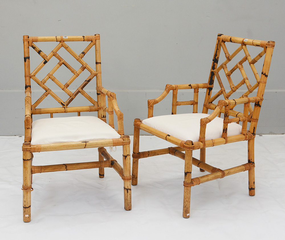 Vivai del Sud Due sedie. Italia, anni '70. Struttura in bamboo con sedute imbottite rivestite in tessuto bianco. Marcate alla base dello schienale. (cm 55,5x90,5x60) (lievi difetti) -EN Due sedie. Italia, anni '70. Struttura in bamboo con sedute imbottite rivestite in tessuto bianco. Marcate alla base dello schienale. (cm 55,5x90,5x60) (lievi difetti)