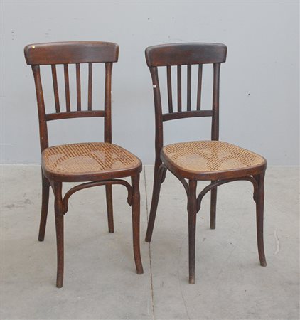 Jacob & Josef Kohn Coppia di sedie in faggio con schienale a giorno e gambe tornite e seduta in paglia. Austria, secolo XX. (gravi difetti)