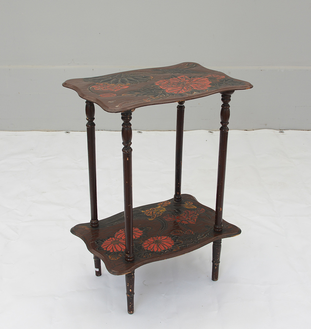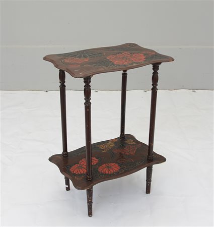 Tavolino a due ripiani di gusto liberty in legno intagliato a bassorilevo e dipinto con soggetti floreali. Italia, prima metà secolo XX. (difetti) -EN Tavolino a due ripiani di gusto liberty in legno intagliato a bassorilevo e dipinto con soggetti floreali. Italia, prima metà secolo XX. (difetti)