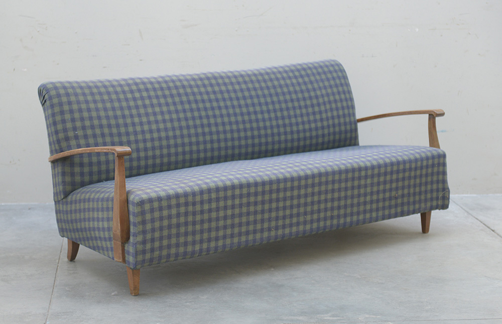 Gino Franzi (Pallanza 1898 - Milano 1971) (Attribuito) Divano imbottito. Italia, anni '30. Struttura in legno e rivestimento in tessuto a quadri verdi e blu. (difetti) -EN (Attribuito) Divano imbottito. Italia, anni '30. Struttura in legno e rivestimento in tessuto a quadri verdi e blu. (difetti) Provenienza Villa Lloyd poi villa Riva, Alpino, Stresa