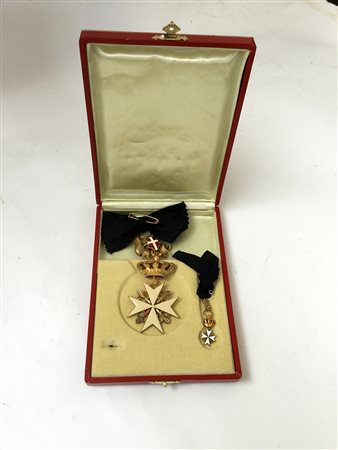 Lotto composto da onoreficenza dei cavalieri di Malta, prodotta dalla ditta Jhonson (Milano) ed insegna da collo di cavaliere di devozione e onestà con acclusa mignon. Entrambe comprensive di nastro nero. Argento 800 dorato e smalti. Italia, prima metà secolo XX (difetti)