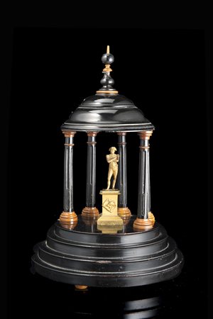 Tempietto in legno tornito e laccato con cinque colonne scanalate e basamento e capitello in bosso. Al centro una statuetta di Napoleone in bronzo dorato poggiante su plinto. Italia, fine secolo XIX (h. cm 36) (difetti) -EN A small wood temple with Napoleon, late 18th century (h cm 36) (defects)