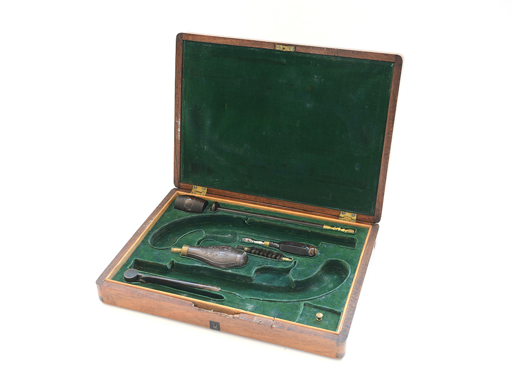 Cassetta per pistola da duello mancante delle pistole ma con i suoi attrezzi. Prima metà secolo XIX (difetti)