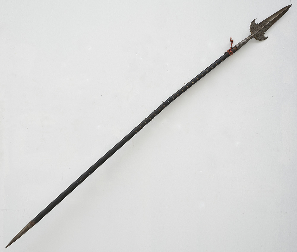 Partigiana con lama costolata a lingua di bue. Ali ondulate ad innesto. Il tutto inciso ad acido con motivi geometrici da entrambi i lati. Montata su asta antica comprensiva di puntale in ferro. Francia, primo quarto secolo XVIII (l. cm 210) (difetti) Tipo di partigiana utilizzata da guardie di palazzo, cattedrali e chiese considerate prodotto di lusso.