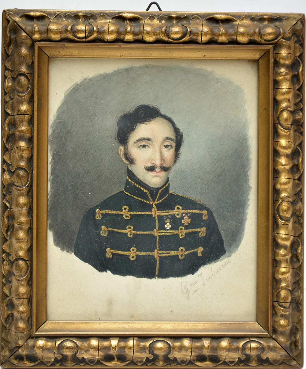 Piccolo ritratto ad acquarello di un ufficiale degli Ussari austriaci. Secondo quarto secolo XIX (difetti)