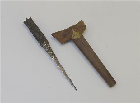 Curioso pugnale malese con impugnatura in legno intagliato a motivo di...