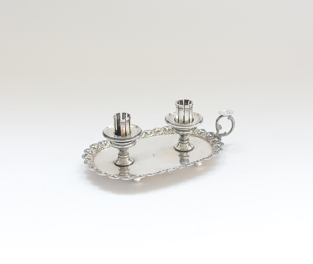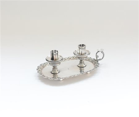 Bugia in argento a due fiamme con bordo sbalzato a foglie e piedi sferici (gr...