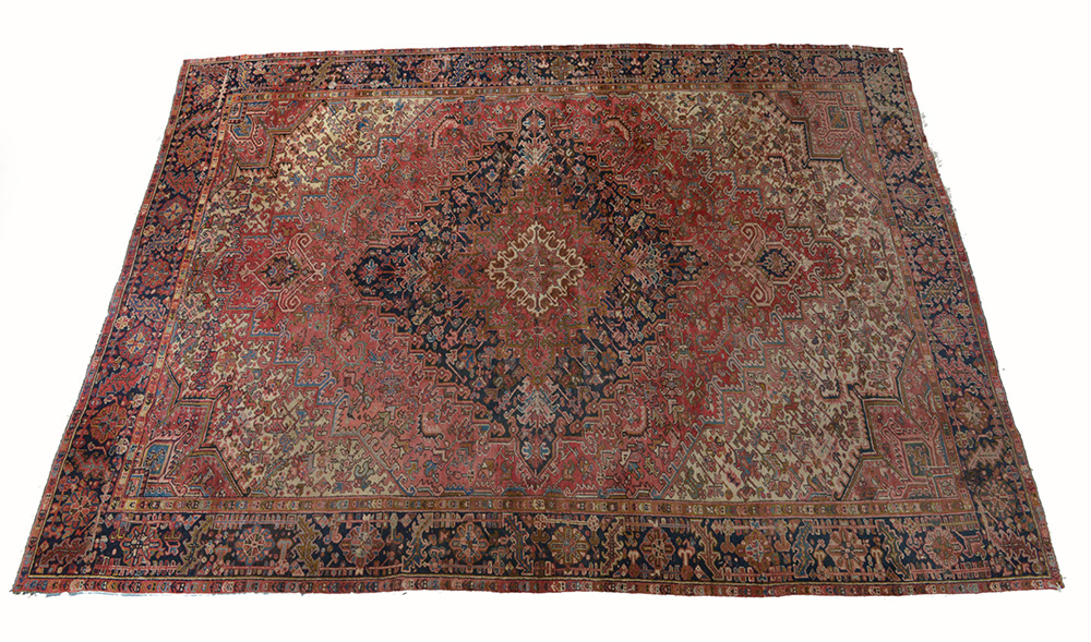 Tappeto Heritz, Persia sec. XX Disegno a medaglione romboidale bianco rosso e blu con puntali su fondo rosso (cm 400x280) (difetti)