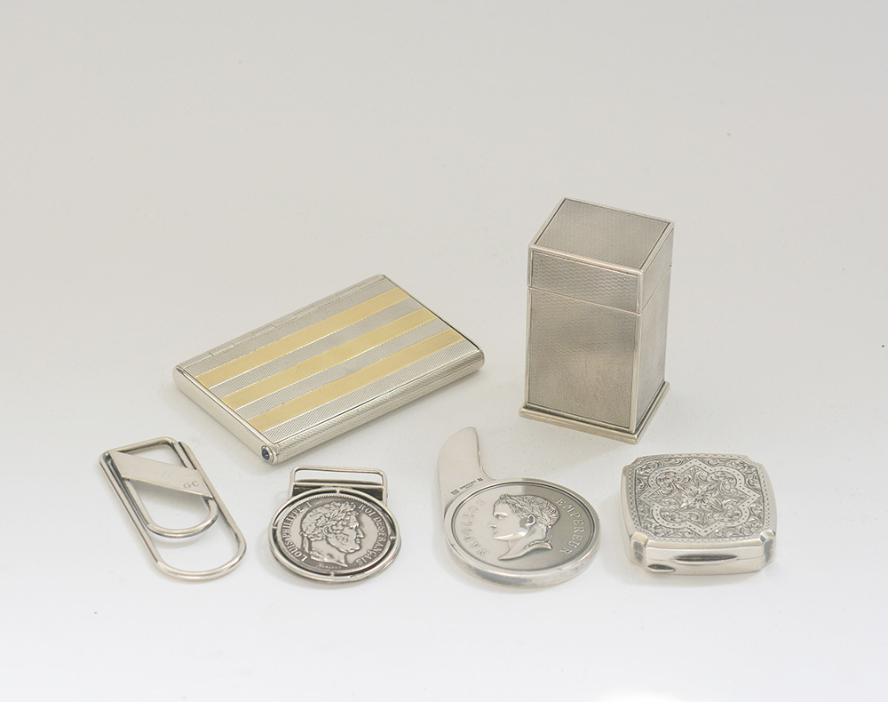 Lotto di composto da un portacipria, un accendino, due fermacarte, un porta pillole e un tagliacarte in argento o metallo argentato