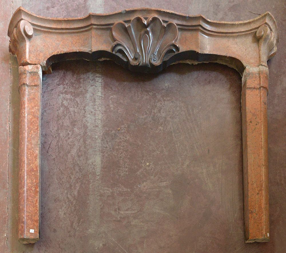 Antico camino in marmo rosso con architrave sagomata scolpita a volute e motivo a conchiglia al centro (cm 168x120) (difetti)