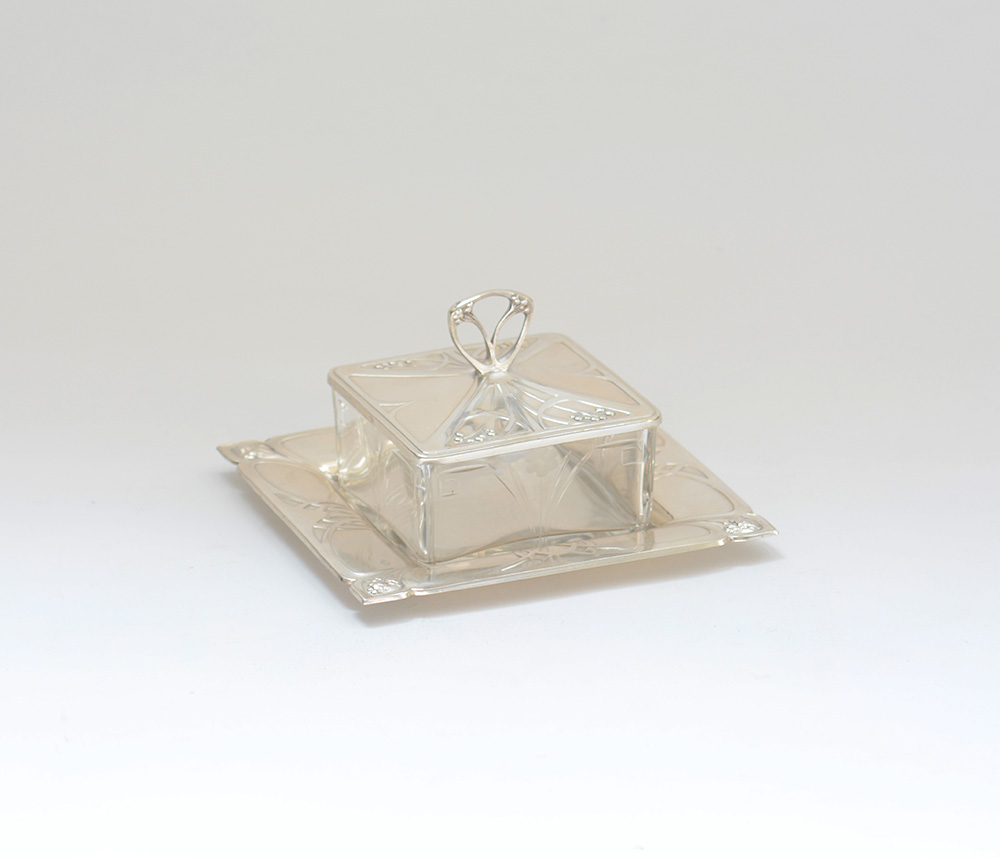 Formaggiera liberty in metallo argentato con contenitore in cristallo molato completo di vassoio