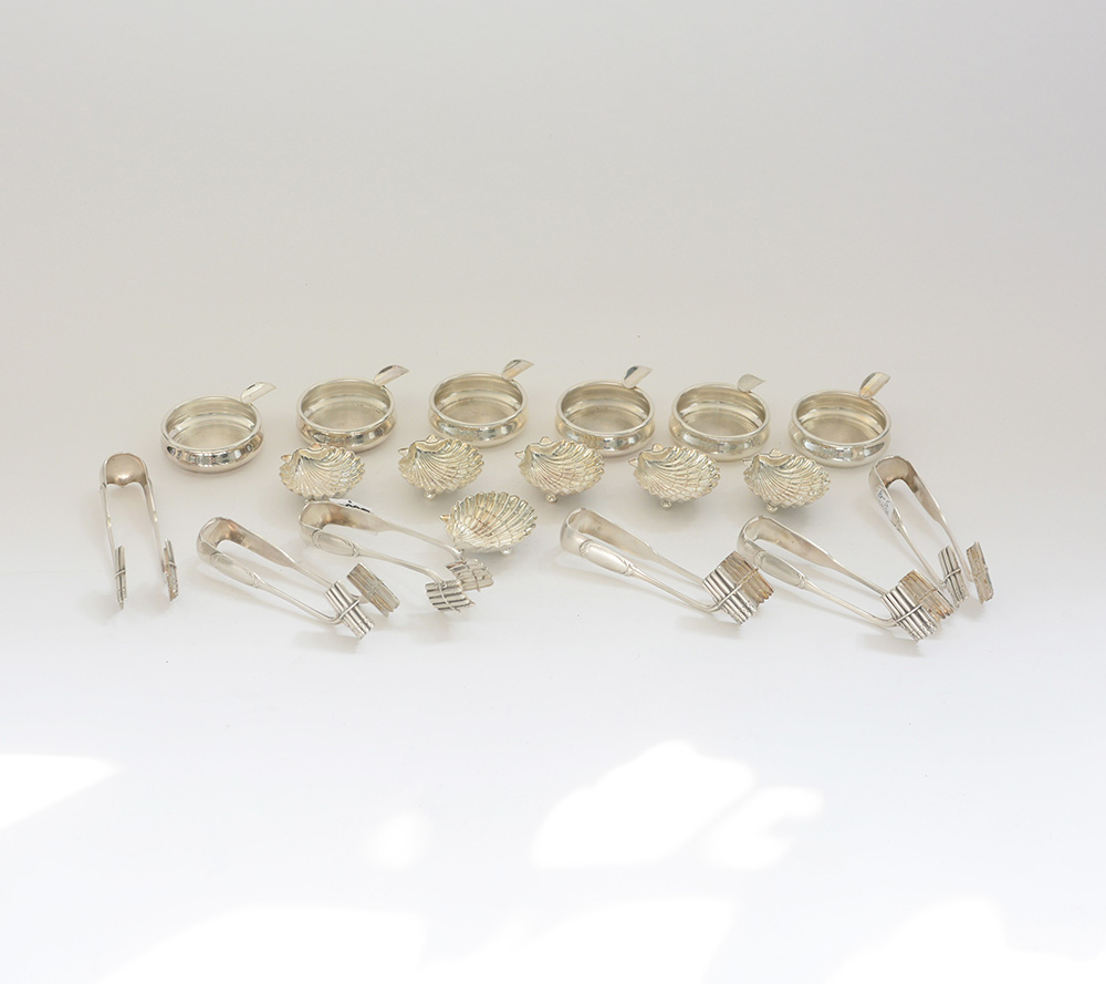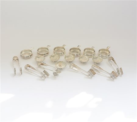 Lotto composto da sei piccole ciotoline a forma di valva di conchiglia, sei piccoli posacenere in argento (gr 230) e sei mollette per asparagi monogrammate in metallo