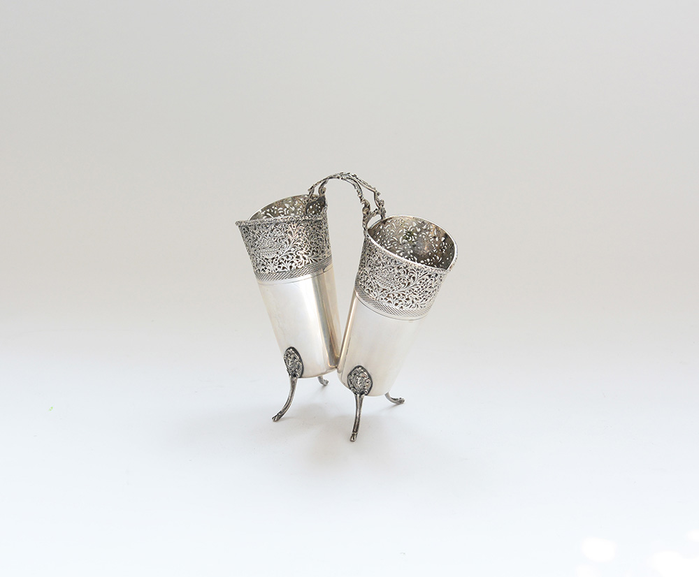 Porta grissini in argento a doppio contenitore con piedini e fascia superiore traforata (gr 370)