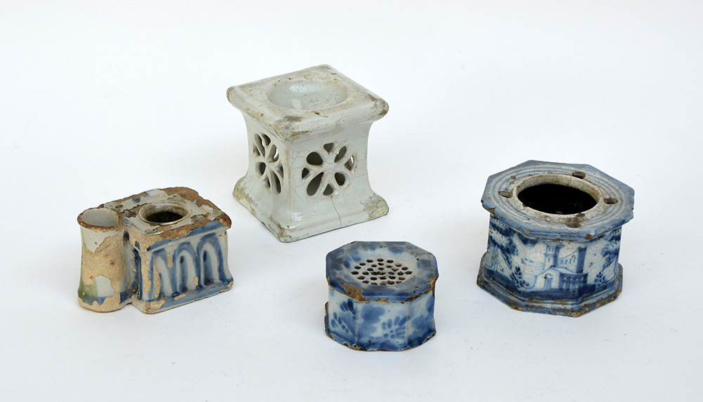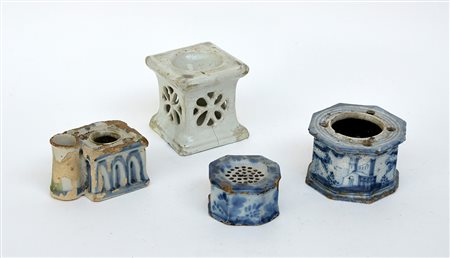 Manifatture diverse secolo XVIII. Gruppo di quattro fra calamai e saliere in maiolica (difetti e restauri)