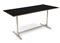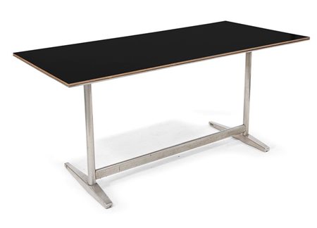 Scrivania in metallo cromato con piano rivestito in laminato plastico nero.