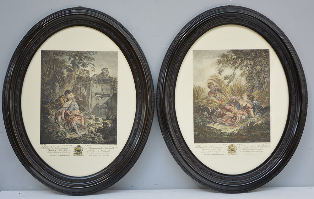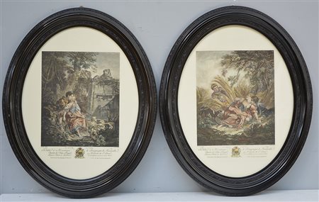Coppia di litografie a colori del sec. XIX raffiguranti scene da dipinti di Boucher (cm 65x49) in cornici ovali