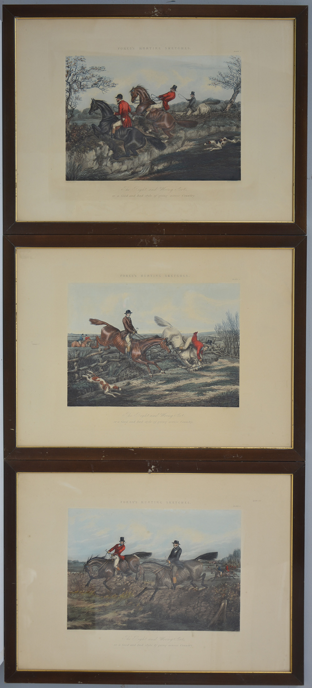 Gruppo di tre stampe inglesi a colori raffiguranti scene di caccia alla volpe, in cornici