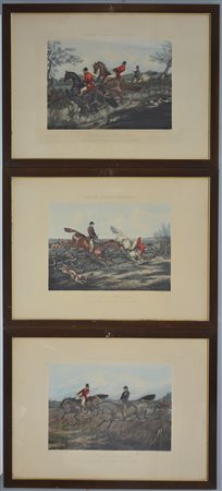 Gruppo di tre stampe inglesi a colori raffiguranti scene di caccia alla...