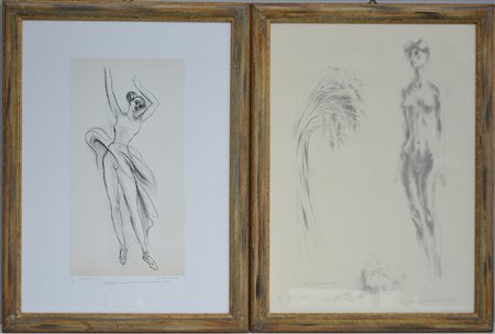Narciso Cassino (Candia Lomellina 1914 - Candia Lomellina 2003) "Ultima mondina" e "Danzatrice" coppia di litografie (cm 70x50) firmate, titolate e numerate in basso, in cornici