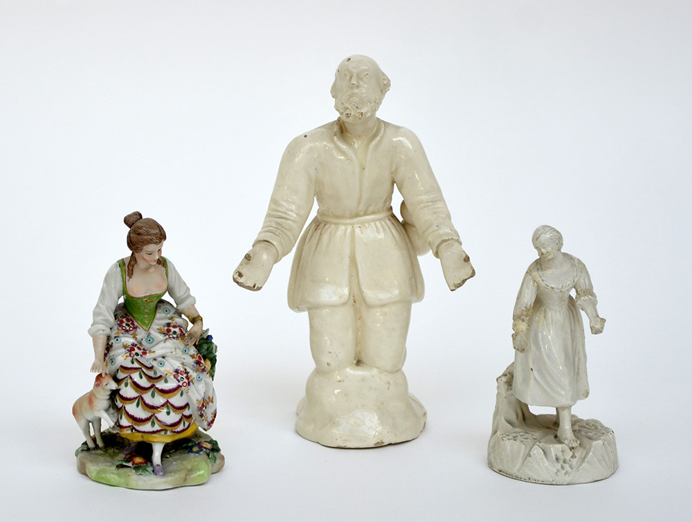 Manifatture diverse secolo XIX / XX. Gruppo di tre statuette in porcellana e terraglia (difetti e mancanze)