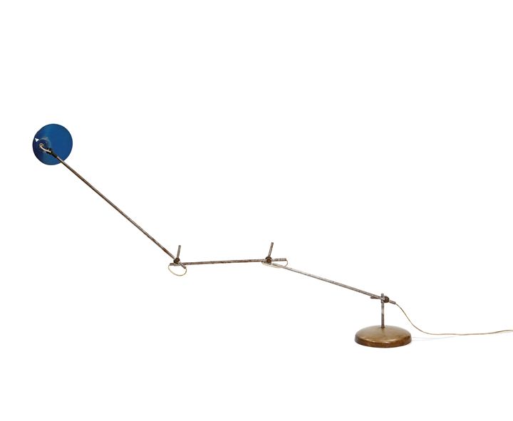 Lampada in metallo cromato formata da tre elementi tubolari uniti da giunti regolabili.
