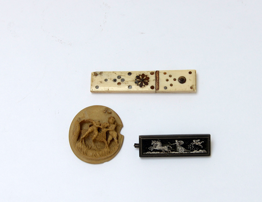 Lotto composto da un piccolo intaglio in pietra lavica, un porta aghi in avorio e una spilla in micromosaico (difetti e mancanze)