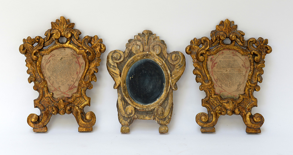 Gruppo di tre cartagloria in legno intagliato e dorato a volute e foglie. Secolo XVIII (difetti e restauri)