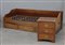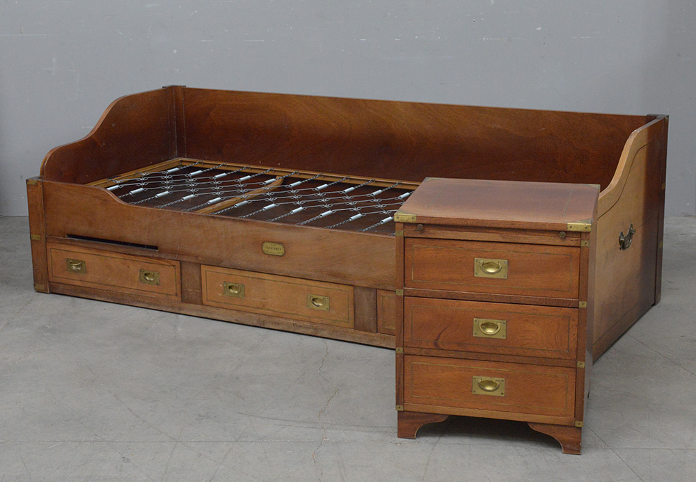 Lotto composto da un letto stile navy ad una piazza con tre cassetti e due tiretti nella parte bassa, ed un comodino di medesimo stile con tre cassetti e un tiretto sotto il piano. Filettature e maniglie in ottone (difetti)