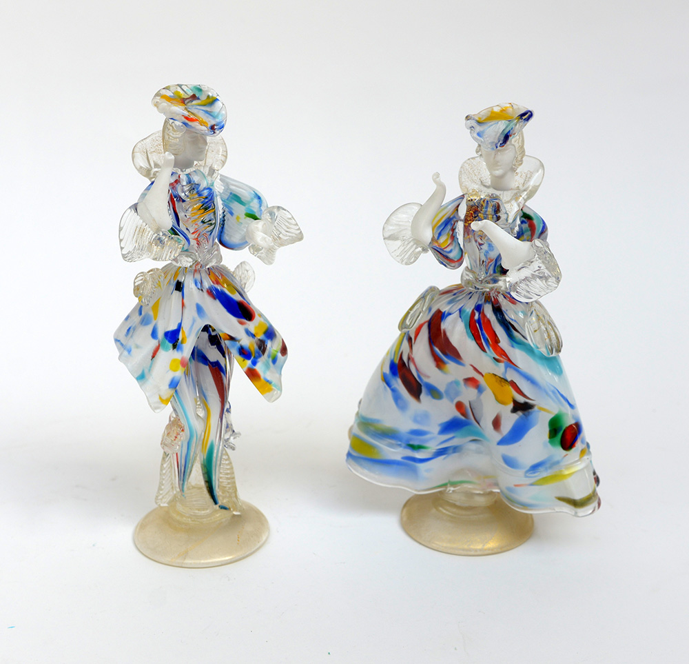 Manifattura di Murano, secolo XX. Coppia di sculture in vetro raffiguranti gentiluomo e gentildonna in abiti ottocenteschi (h. cm 26)