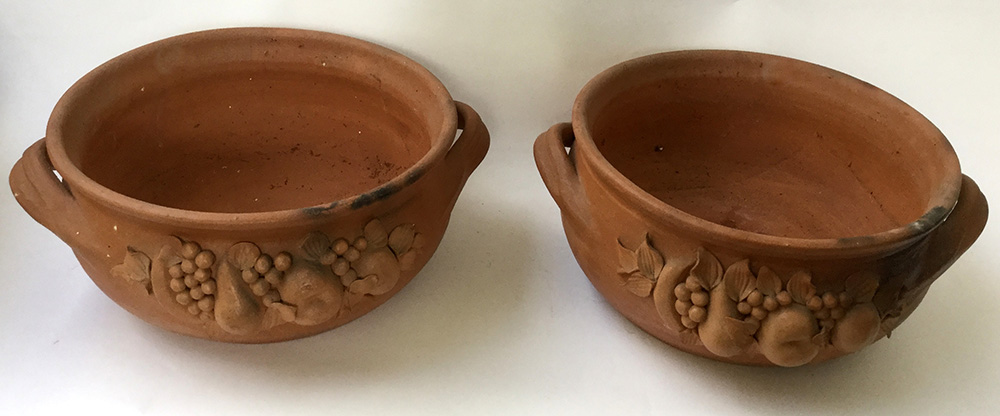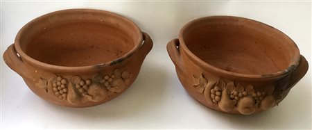 Coppia di portavasi biansati in terracotta decorati con frutti in rilievo (difetti)