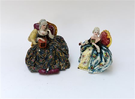 Fabris e manifattura italiana. Due sculture in ceramica policroma raffiguranti gentildonne assise (misure diverse, difetti)