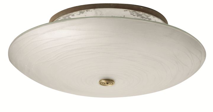 Grande coppa in cristallo curvato e incisa all'acido con motivo a spirale, disco superiore in vetro satinato, portalampade in alluminio laccato.