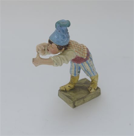Scultura in ceramica policroma raffigurante un bambino. Etichetta cartacea al verso della manifattura Schioppa e Cacciapuoti (difetti e mancanze) (h cm 19)