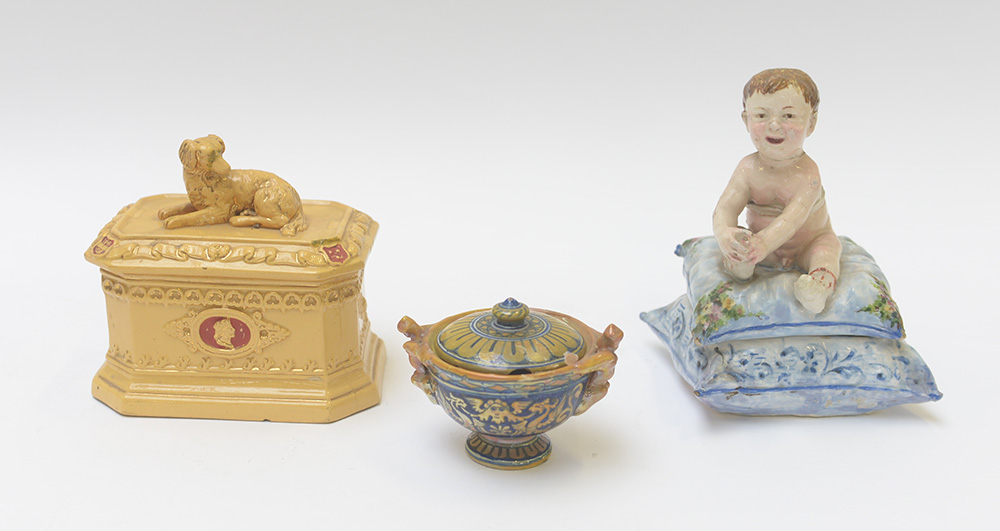 Lotto composto da tre scatole in porcellana e ceramica, una marcata C.I.M.A.Perugia (difetti)