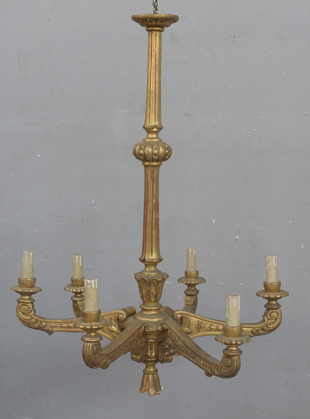 Lampadario a sei luci in legno dorato, decorato a motivi vegetali (difetti)