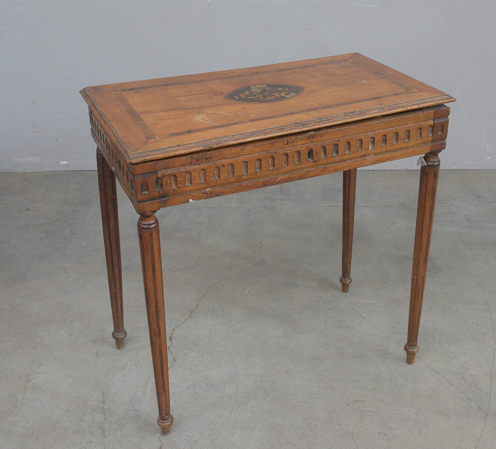 Tavolino da lavoro con piano ribaltabile filettato e intarsiato, gambe...