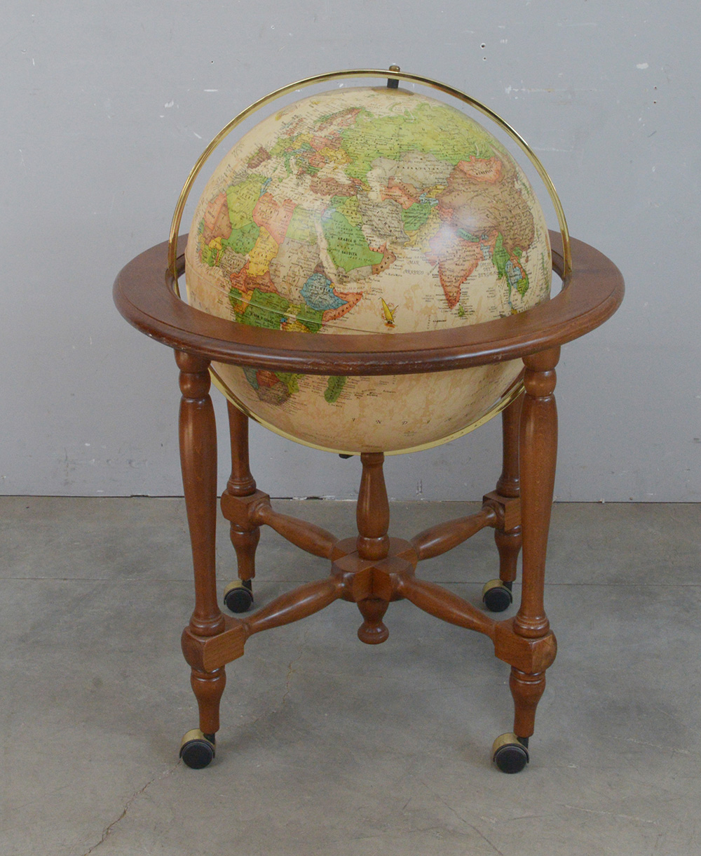 Mappamondo moderno con lampada. Gambe e traverse tornite terminanti con rotelle (difetti)