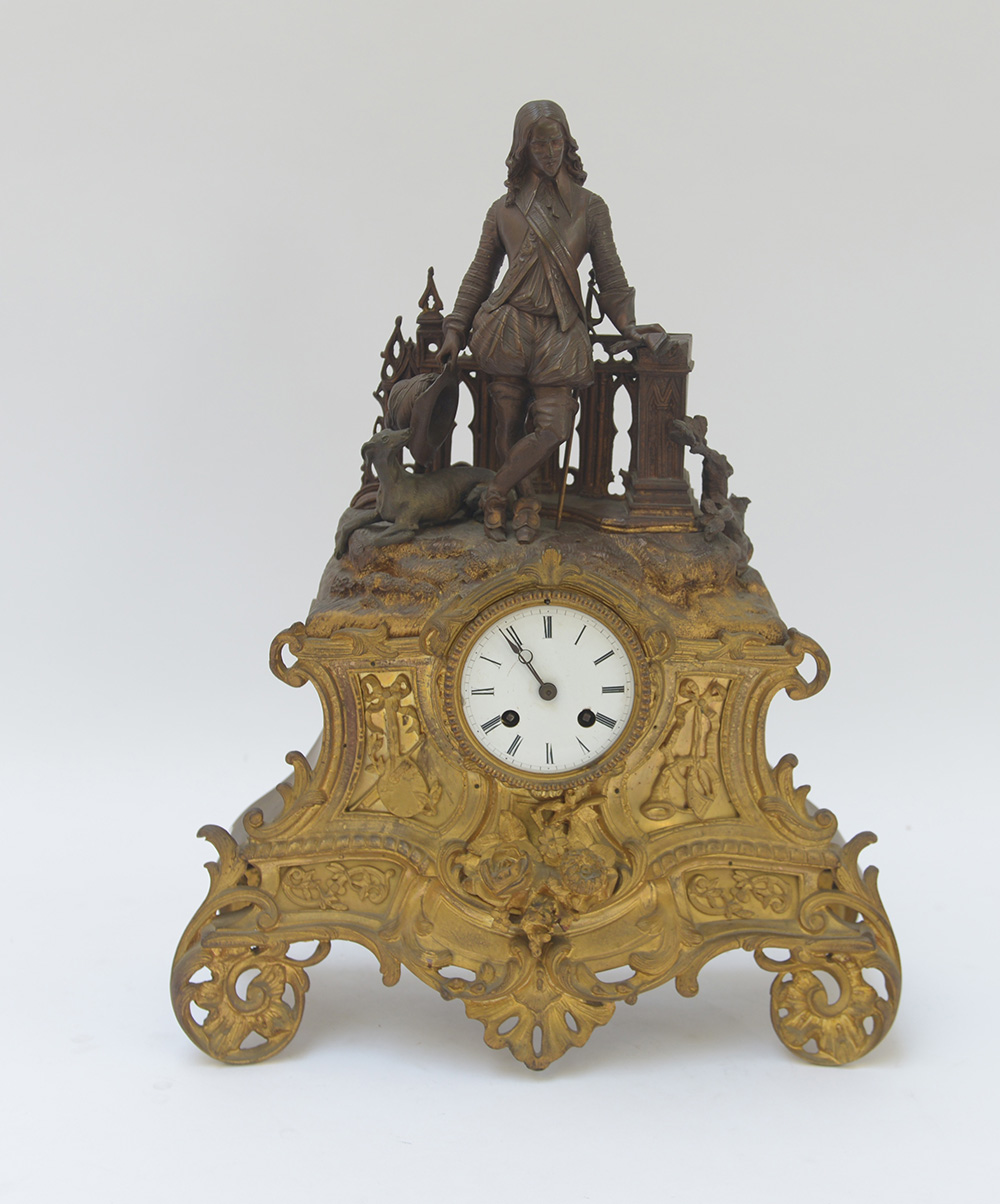 Orologio in antimonio decorato con cavaliere e cane, movimento a carica...