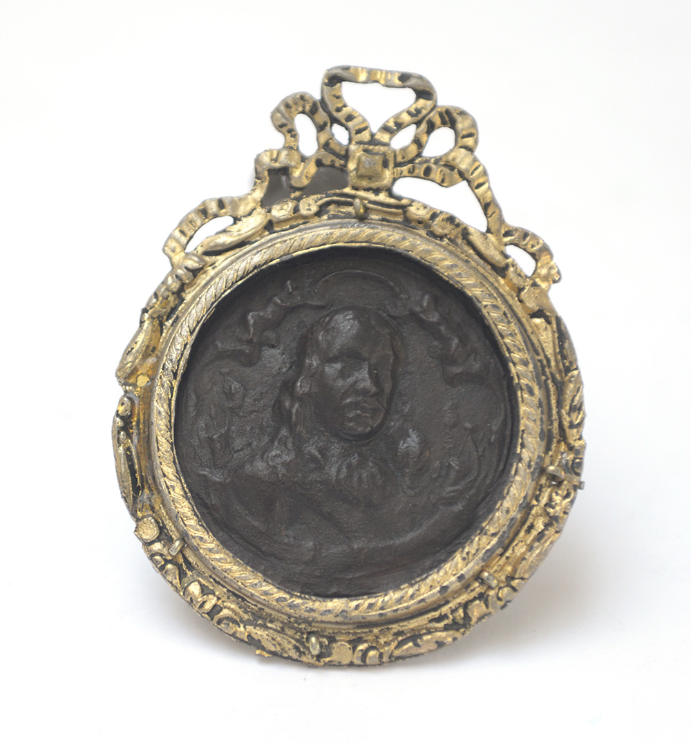 Bassorilievo in bronzo raffigurante un volto sulla parte anteriore e due navi al verso. Cornice in metallo dorato (cm 9,5x12x5) (difetti)
