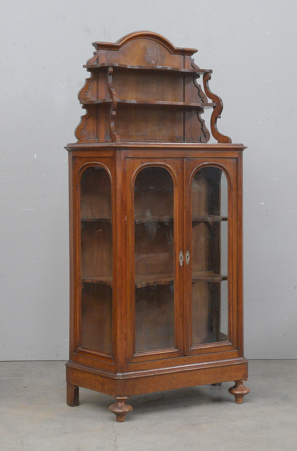 Vetrinetta a due sportelli, alzata a giorno con montanti sagomati e piedi a cipolla. Fine secolo XIX (cm 80x165x37) (difetti)