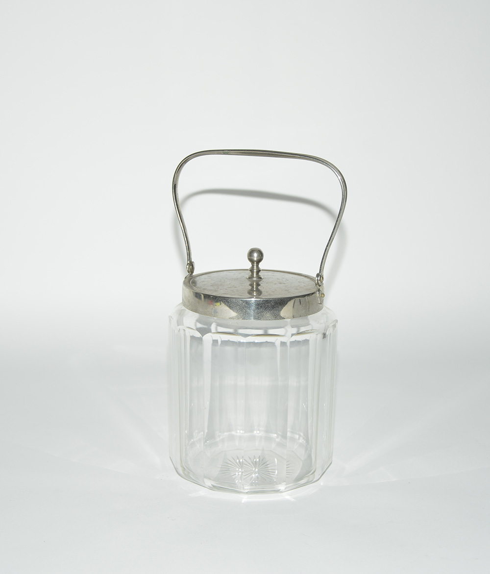 Seccchiello portaghiaccio in cristallo sfaccettato con coperchio e presa in metallo.