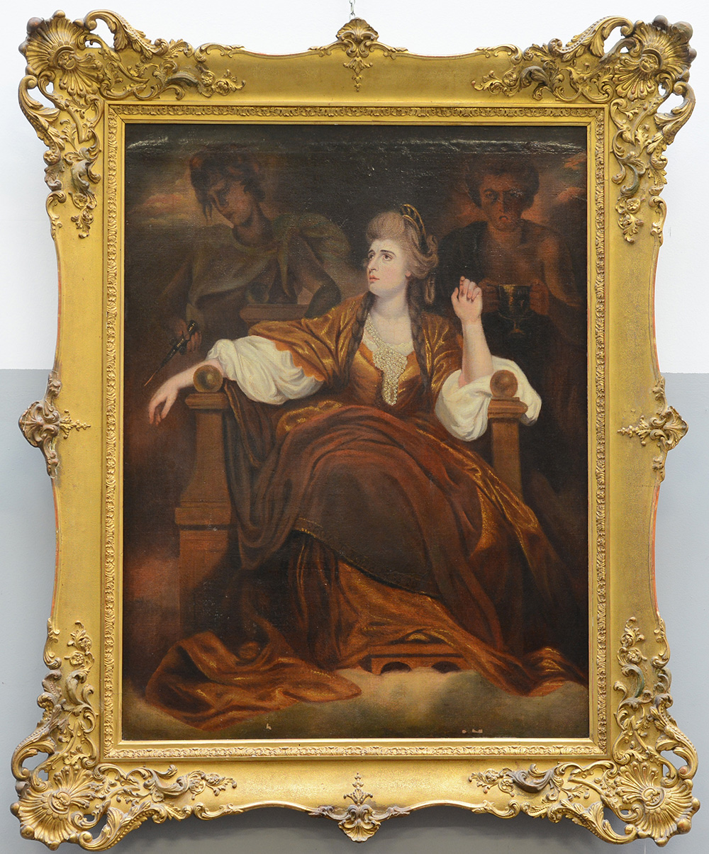Ignoto "Donna su trono con figure allegoriche" olio su tela (cm 100x77) in cornice del secolo XIX in legno e pastiglia dorata (difetti)