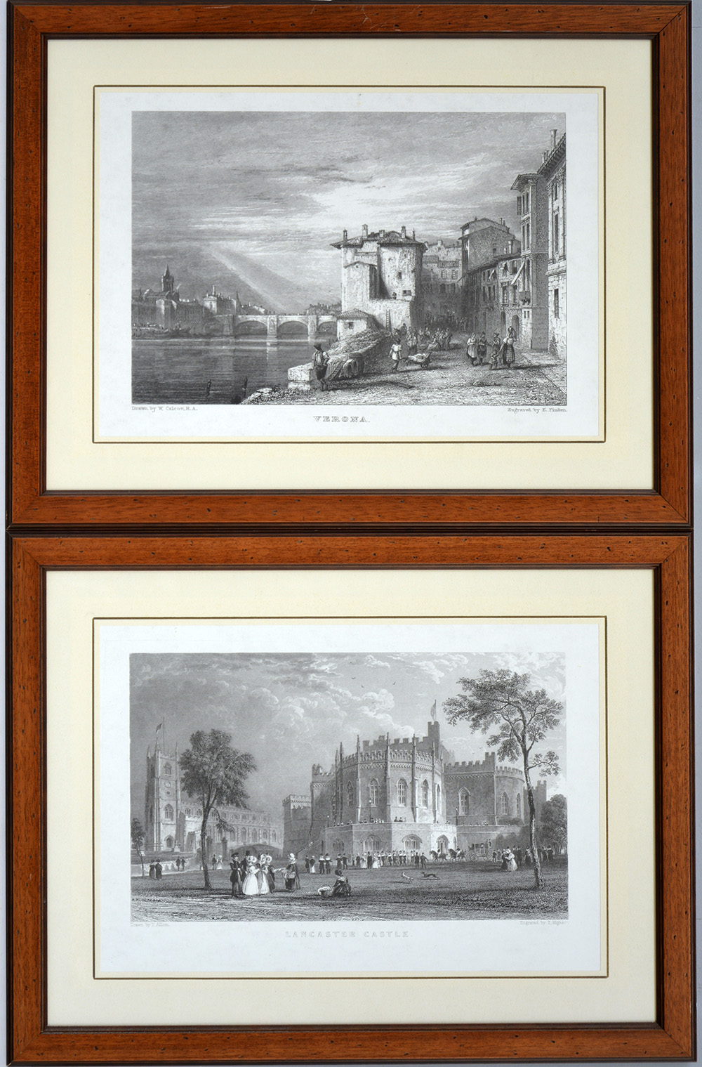 Lotto 3122 | Coppia di riproduzioni raffiguranti paesaggi con edifici (cm tot 48x62) in...