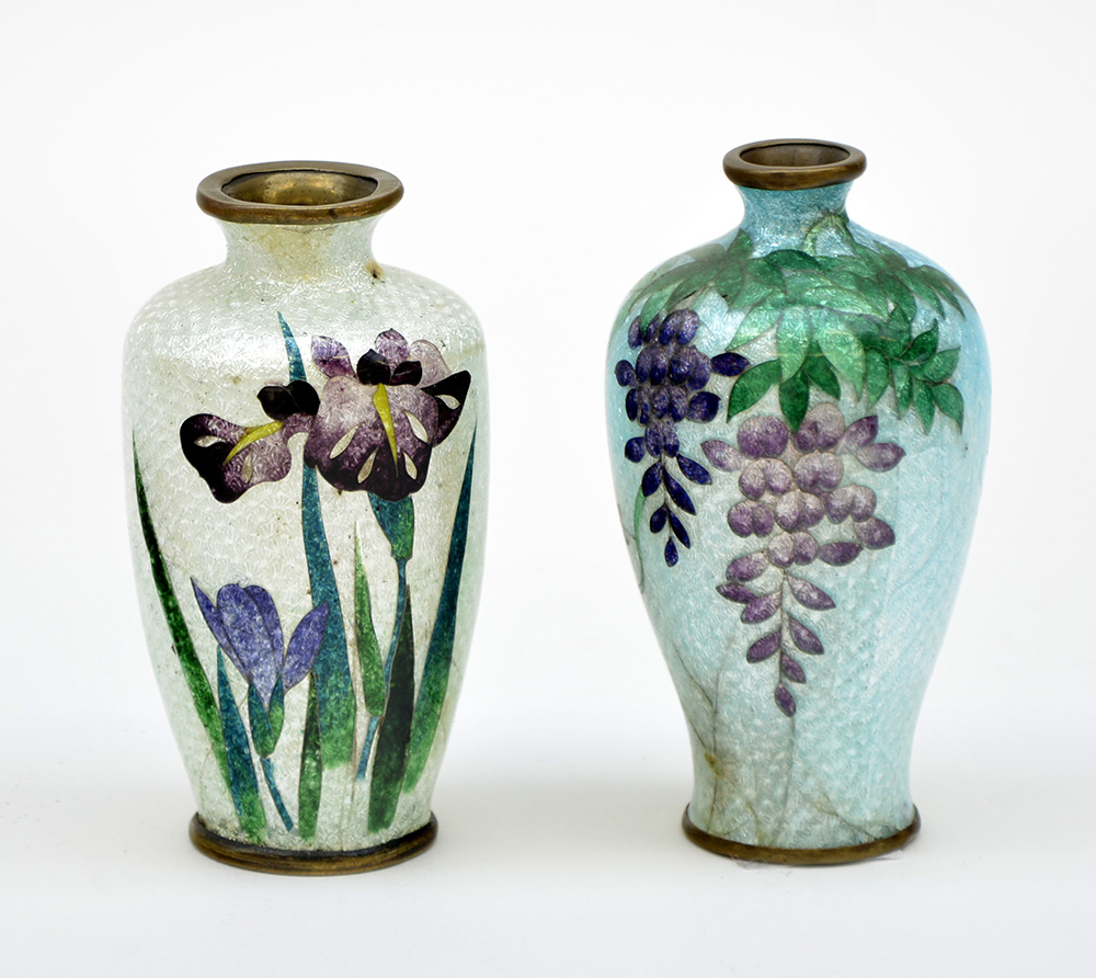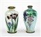 Lotto di due vasetti in metallo decorati a smalti con rami fioriti (h cm 9) (difetti)