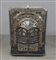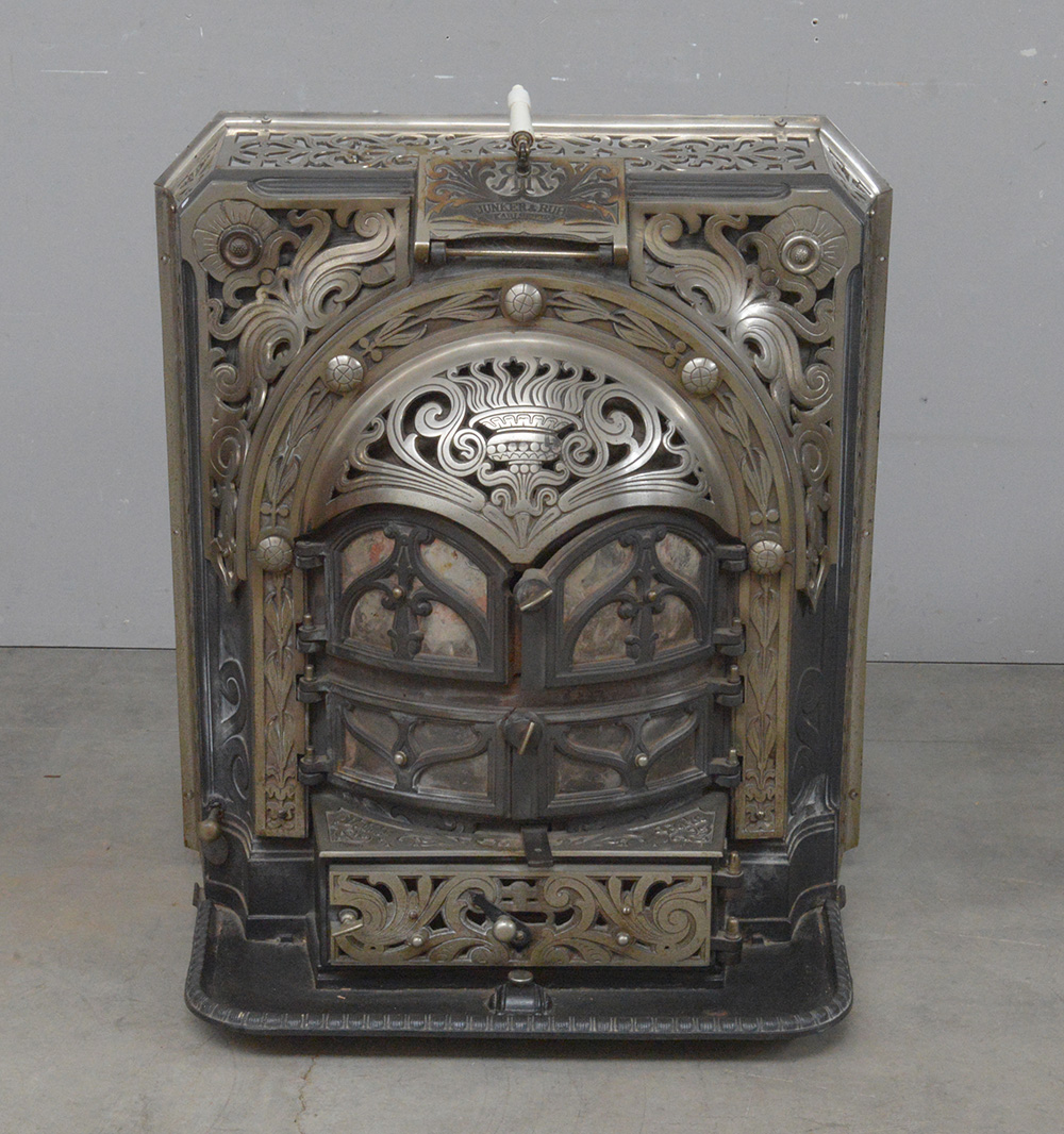 Stufa a legna di manifattura tedesca, marcata Junker & Ruh, con struttura in metallo traforato a volute (cm 77x84x50) (difetti)