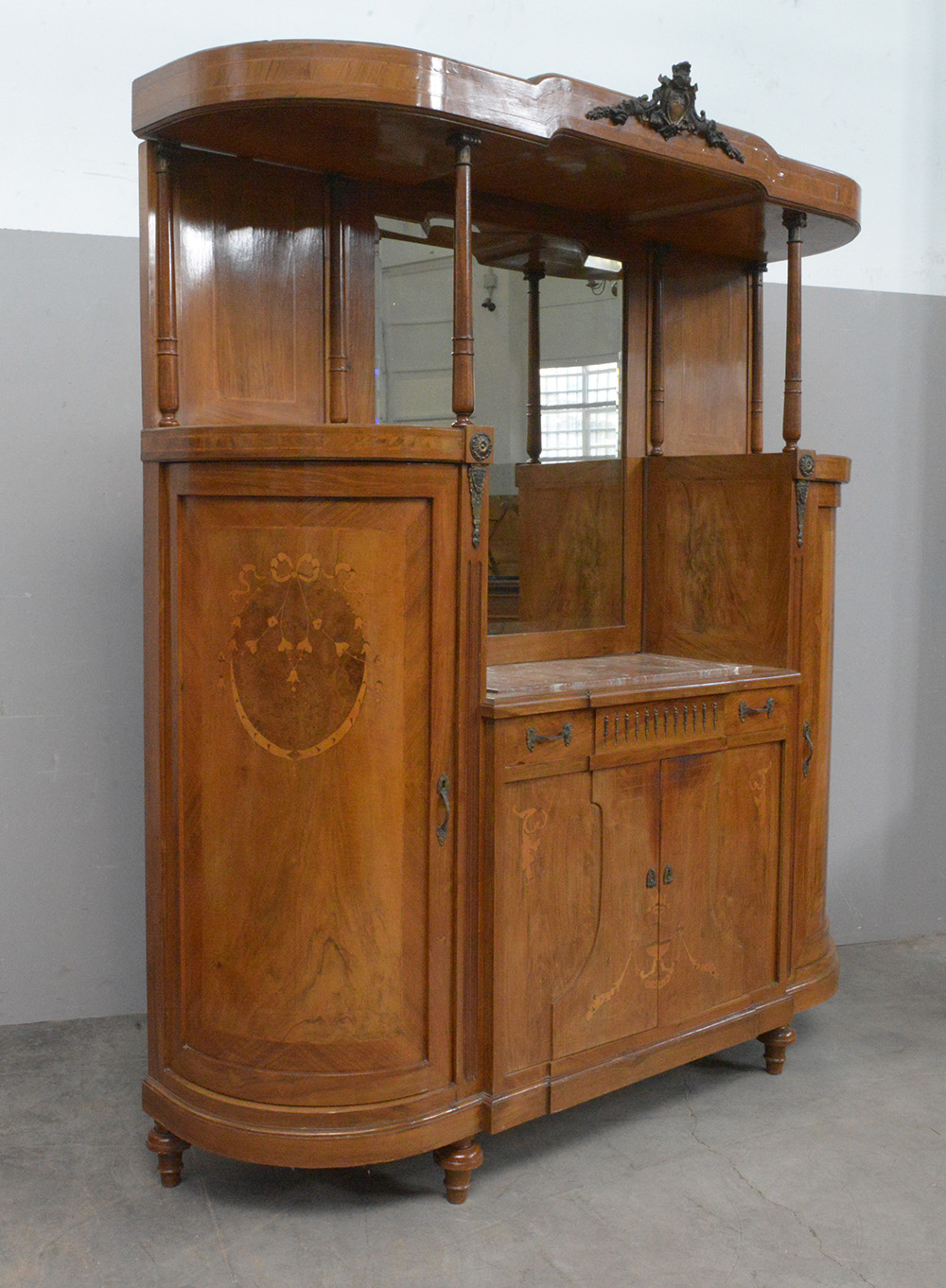Contro buffet filettato e decorato con intarsi floreali, piano centrato da marmo rosso e sormontato da specchio. Prima metà del secolo XX (cm 190x228x55 circa) (difetti)